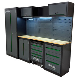 Die Stahlwerk SW88 Werkstation ist eine professionelle Komplettlösung für die anspruchsvolle Werkstatt. Aus hochwertigem Stahl gefertigt und mit einer robusten Holzarbeitsplatte ausgestattet, vereint dieses System Funktionalität, Langlebigkeit und ein modernes Design. Dieses Modell besteht aus 12 Modulen mit einem umfangreichen Satz hochwertiger Handwerkzeuge, übersichtlich in Schaumstoffeinlagen angeordnet. Das Werkstation verfügt über einen herausfahrbaren Werkzeugwagen, der flexibel auch außerhalb des Werkstattsystems eingesetzt werden kann.